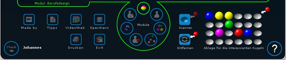 Auf der rechten Seite sind der Scanner für das Ablesen der Informationen der Berufe aus den jeweiligen Kugeln angebracht sowie 24 Mulden, um darin die Kugeln von interessanten Berufen abzulegen.