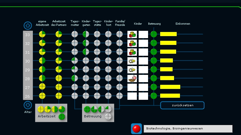 Verschiedene Möglichkeiten der Vereinbarkeit von Familie und Beruf können in diesem Modul durchgespielt werden. Die Geburt eines Babys bestimmt man mit Klick
